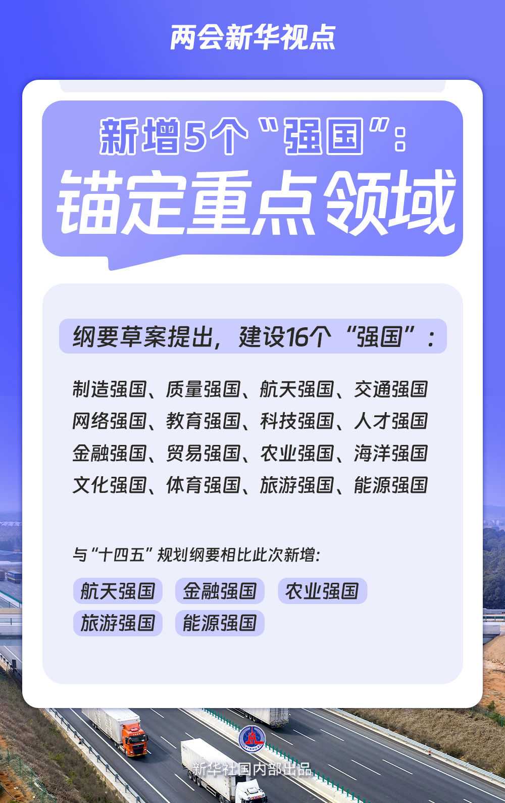 农业强国、金融强国、航天强国、能源强国、旅游强国……纲要草案在原有科技强国、文化强国等“强国”建设的基础上,新增5个“强国”建设目标,总数达16个。